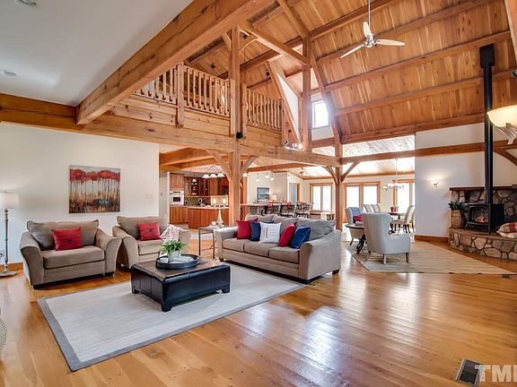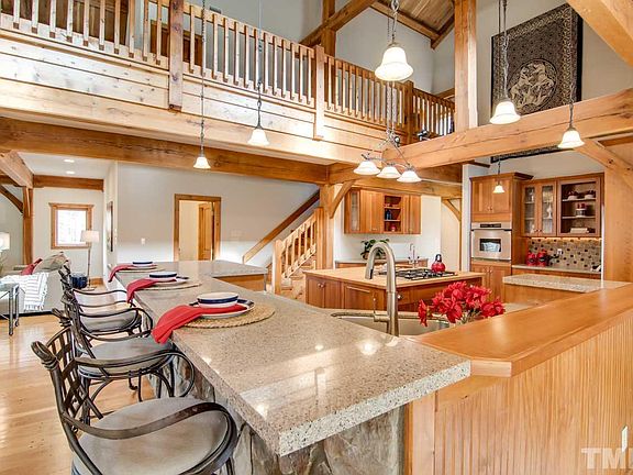 Custom designed and built, timber frame home with horse barn! Split rail, divided pastures with easy access to Tobacco Trail. Spiral staircase, 4 bdrm, 3 bath, on 6.77 acres, offers an open floor plan, quartz counters w/ unique light fixtures. Butcher block kitchen island. Pegged oak wood floors, Pella windows. First floor owners suite, 3 car garage and unfinished basement waiting to be converted. Barn contains 2 horse stalls with room to expand. Bar stools, washer, dryer, & new refrigerator convey.