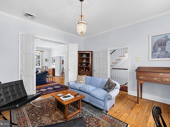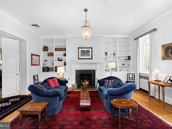 Built in 1823, this authentic Federal home is one of three distinguished houses shown on the south side of West Street, between Washington and Greene Streets, on James Keily’s map of Georgetown from 1851. This rare residence has been meticulously preserved and modernized by the present owner, offering an exquisite blend of historic charm and contemporary convenience. The property is further enhanced by an impressively deep south garden, a staple of the Georgetown Garden Tour since its inception, known for its extraordinary plantings, low horizon line, and general orientation that create a captivating landscape enjoyed from every level of the house. Upon entering, the generous entry hall showcases original details and 10-foot ceilings, setting the tone for the elegance found throughout the main level. The double drawing room, filled with natural light from two exposures, features original fireplaces, antique light fixtures, and built-in bookshelves, creating a timeless and classic Georgetown space. At the end of the hallway, a butler's pantry includes a south-facing window, coat closets, a wet bar with a fridge, a powder room, an elevator, and access to a charming south-facing porch, providing both practicality and style. The ground floor is designed for both elegance and functionality. A side entrance leads to a hallway flanked by storage and access to a second powder room. The large, light-filled kitchen boasts granite countertops and backsplash, Leicht cabinetry with modern conveniences such as a fold-out pantry, piston drawers, and roll-out cabinets. Top-of-the-line appliances include a Sub-Zero refrigerator with two freezer drawers, a five-burner cooktop, a built-in microwave, and a wall oven, complemented by an additional bar fridge and Sub-Zero freezer behind the granite bar. Adjacent to the kitchen is a spacious utility room. This level also features a large dining room with a fireplace and a cozy, light-filled family room with built-in cabinets, offering direct views and access to the garden through large glass doors. The second floor comprises two expansive, light-filled bedrooms, each with matching fireplaces and en suite bathrooms. One of the bedrooms includes a dressing room with a large window that provides abundant natural light. Double doors connect the rooms, offering flexibility in how the space is enjoyed. The back bedroom has elevator access, adding to the home's modern conveniences. The third floor has two additional bedrooms and a split bathroom with a water closet, providing ample space and privacy. This is a rare opportunity to own a fine example of Federal architecture. The significant historical value and modern amenities is perfect for those who appreciate the timeless elegance and functionality of Georgetown's architectural heritage.