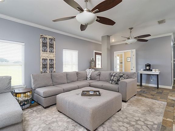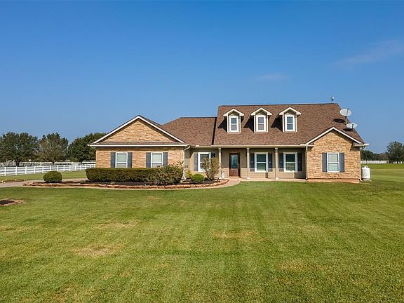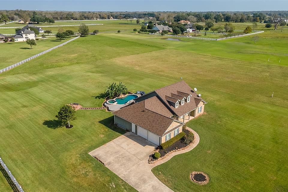 Charming Home sitting on 2 acres in beautiful Suncreek Ranch. No flooding here. Enjoy being outside all year round in this country living home with heated inground pool, hot tub, firepit and covered back patio. Sit out and watch the stars at night with no city lights. Interior offers large Kitchen with custom cabinets, granite countertops, stainless steel appliances to include the refrigerator. Breakfast area with great views. Hardwood and slate floors throughout the home. Spacious family room with crown molding, 2 ceiling fans, and large windows to let in lots of natural light. French doors open to study just off the family room. The laundry room has an extra sink. The primary suite has hardwood floors, crown molding, 2 walk-in closets, large walk-in shower and an oversized tub. Roof 2 years and TRANE AC only 1 year old. Don't let this one get away!