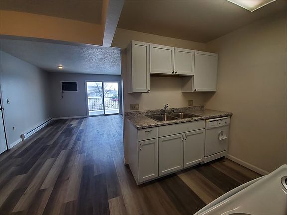Updated 2 bedroom 1 bath Large balcony Coin Laundry in Building Security building Dishwasher Window AC 1Assigned off Street parking space 1 car garage with remote Tenant pays electricity and hot water (baseboard heat, water heater electric). Tenants is responsible for removing snow off balcony/patio and 3 feet in front of garage. Owner pays: cold water, sewer, garbage - (lawn and snow/parking lot) care included in rent.