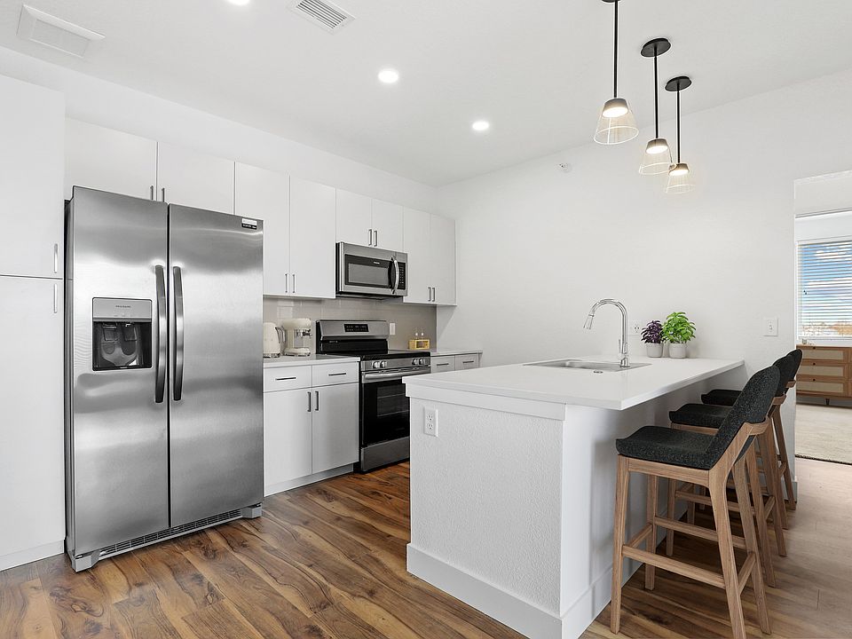 • Exterior features: Barbecue, Bicycle storage, Built-In Closet Shelving, Flooring: Wood, High-speed Internet Ready, Modern Pendant Lighting, Pet-Friendly Community, Plush Carpeting in Bedrooms, Quartz Countertops, Stainless Steel Appliances, TV Lounge, Tall Euro-Style Cabinets in Grey, USB Outlets, White Subway Tile Backsplash