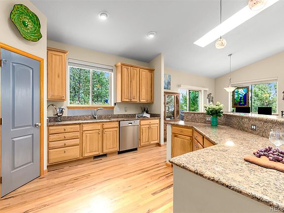 Tucked away on a beautifully wooded lot, this warm and welcoming house is right in an easy North Evergreen spot. This unique ranch offers highly sought after main floor living. Beckoning you to enter, the completely open great room has warm hickory floors, an oversized stone fireplace and floor to ceiling windows. A large, updated kitchen with stainless appliances and an enormous island with eat-in bar top provides a wonderful entertainment space. The dining area opens out to a large deck, perfect for summer grilling or watching the wildlife pass through. Spacious main level master suite features vaulted ceilings and 5-piece bath. Additional living space and bedrooms in basement add to the functionality of this home. Oversized 3-car garage plus additional shed for storage. Beautiful professional landscaping as well as a freshly paved driveway add to the curb appeal. This home has been impeccably maintained and it really shows!