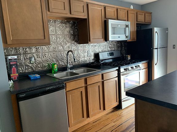 Two bedrooms with one bath , stainless steel appliances stove, refrigerator, dishwasher, microwave, island in kitchen, ceiling lights,central air conditioning, hardwood floors Owner pays garbage removal , sewer , one year lease