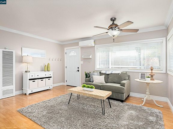Adorable, single story 1950s home right near the Walnut Creek border. Enter through an updated front door to living room with crown molding, ceiling fan, and wood-look laminate floors that carry throughout most of the house. The updated kitchen features stainless appliances, tile floor, updated cabinets, gas stove, garbage disposal, refrigerator and recessed LED lighting. Relax in a spacious bonus room that offers many windows, walk-in storage closet, ceiling fan, and door to the back yard. A central bathroom offers soaking tub with shower + glass door, tile floor, plus an updated vanity. Mud room/laundry area includes storage cabinet and washer + 220v dryer. The large back yard space features concrete patio, crushed gravel walkways, play structure, and a large storage shed/shop. Other features include: Dual pane windows, raised panel doors, and 5 zone mini split heat/air conditioning system. Conveniently located near grocery stores, shopping, restaurants, schools, Larkey Park, HWY 680, and just 1.5 miles to Pleasant Hill BART.
