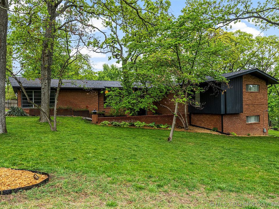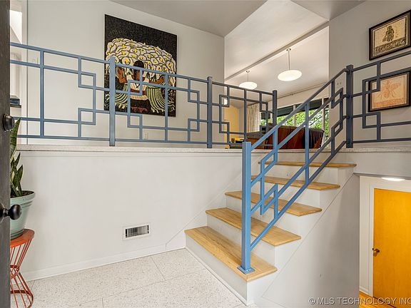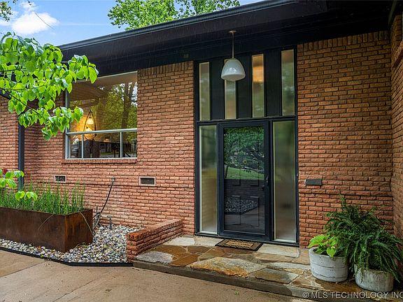 Architecturally-designed mid-century modern home south of Southern Hills CC. Located in cul-de-sac on a large, park-like lot surrounded by mature trees. Open floor plan and thoughtful updates throughout. Original terrazzo, plus new and refinished hardwood flooring, custom-designed hardware and railings; large double fireplace in living room and lower-level den. Expansive window and skylights offer 14 hours of natural light. Walkout lower-level accessible to pool and professionally terraced yard with mature perennial garden, patio, and fire pit. Upper, flat and landscaped lawn at backside of 3-car garage. Newly remodeled kitchen and baths. Custom steel outdoor planters and sculptures.