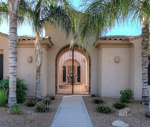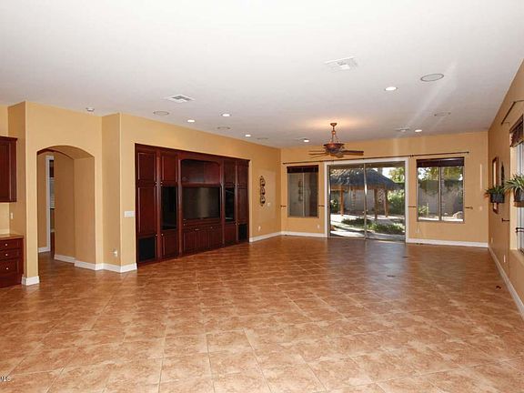 This single level Toll Brothers executive style home has everything - 4,400 sq ft with split plan 5 bedrooms and 3.5 baths in the main house and 1 bedroom and 1 bath in the casita, gated courtyard with fountain, 40' long open plan kitchen and great room, breakfast bar, granite countertops, 42-in dark maple cupboards, 18-in diagonal tile and 5-in baseboards throughout, surround sound, huge office with built-ins, wood blinds, upgraded wood interior doors, extra-wide hallway with 3 double-door closets, garages for 4 cars. It sits on a .8 acre lot where multiple sets of glass doors open to a tropical paradise featuring covered patios, a pebble tech pool with a water feature, slide and baja ledge, tiki huts, surround sound and lush landscaping. Close to freeway, shopping, restaurants, schools.