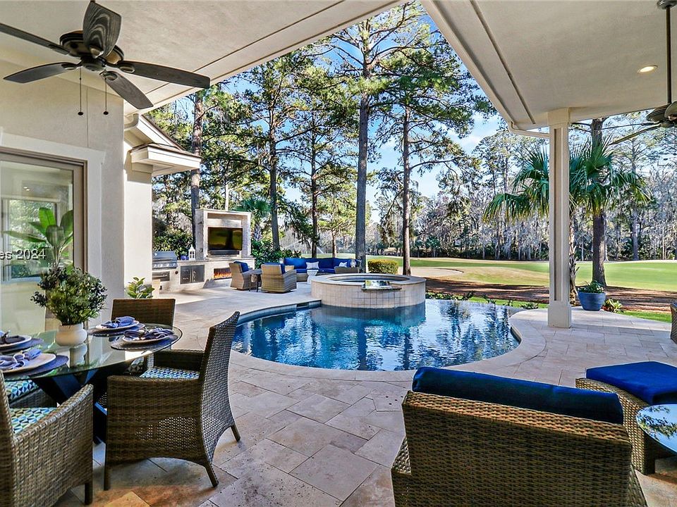 Perfect oasis outdoor living with golf view on Belfair's 12th hole of the East course with infinity edge pool, decking, outdoor kitchen, TV, fireplace. This home offers up-scale and up to date finishes with Neff cabinetry in the chef's gourmet kitchen. Garage is heated and cooled with Cabinets by Design and Swiss Trex flooring This square footage of 896 is not added to the square footage in this listing even though it is heated and cooled. All recessed lighting replaced, new roof, up lighting, landscaping, sod. This home is ready for the next Belfair owner to begin enjoying life with family and friends immediately.