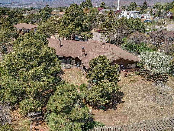 Spacious Barranca Mesa treasure on a canyon lot! This lovingly maintained home offers some nice mid-century modern elements including angled wood-beam ceilings and a beautifully bright sunroom connecting the heart of the home to the outdoors via a four-panel slider door. Elevated formal living area provides an inviting entertaining space with beamed ceilings, canyon and mountain views, outdoor access, and a unique curved brick wall with fireplace and slate hearth. The large primary suite is located off the living area and offers lovely views, slider door access to the deck, en suite with dual sink vanity, and office space! The open concept formal dining and kitchen connect with the sunroom and an additional living area with another stone fireplace - wonderful for gatherings of any size! Two main level guest rooms (one with its own vanity), a full bath, and laundry room complete the main level. Downstairs provides another living space, a bathroom, and a guest room/office/gym with access to outside to enjoy more views! The outdoor space of this home is wonderful multi-level deck with canyon and mountain views, flagstone patio, picnic area, trees, and room to spread out and enjoy the amazing space! Newly finished attached two-car garage with new cabinets and shelves and garage door with direct entry to the kitchen provides convenience. New interior paint on second floor, added blinds in bedrooms, living room and office, and new gutters and storage shed. Come see this beauty!