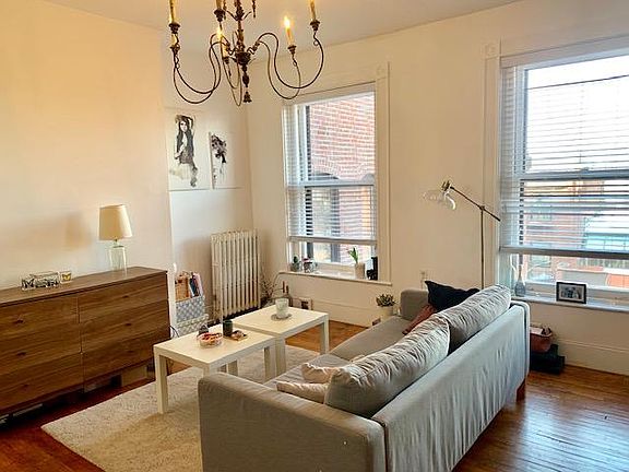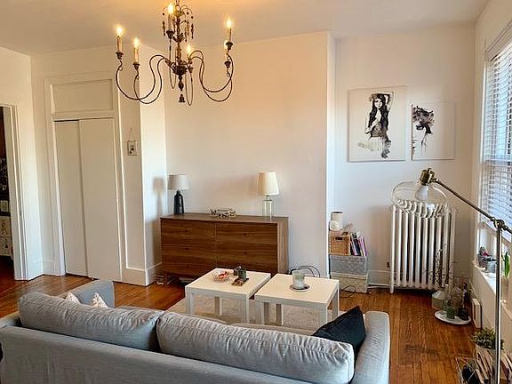 Recent Renovation! Sunny Top Floor One Bedroom features refinished hardwood floors, high ceilings, beautiful chandeliers, three windows facing Back Bay rooftops, eat-in kitchen with wood floors, quartz counters and stainless steel appliances, marble tiled bath with pedestal sink and bathtub. No students, professionals only!
