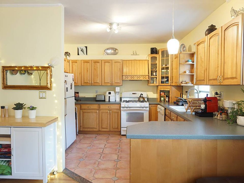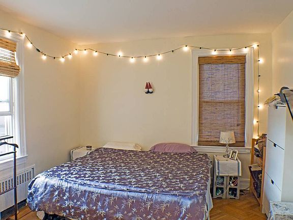 Beautiful Sunny 3 Bedroom Top Floor Apt. On Amazing Block This is the top floor of a 2 family house on an amazing block. The house is a classic old school 100+ year old 2 family beauty with lot's of original details. The dimensions of the house are 20 X 60. The apartment has one extra large bedroom in the back of the house (18 X ll.5 feet), 2 smaller rooms in the front of the house which could be used as bedrooms or offices. The kitchen is quite large with lot's of counter space, tile floor, and great condition wood cabinetry and open layout allowing easy hang out with people in the dining room or your kids/friends/partners sitting on a bar stool on the other side of the island. Dining room is large enough for a decent size table. Living room is very sunny because of it's many windows There is one bathroom with both shower and separate large free standing bath tub. Some additional interesting details include traditional high offered ceilings, hard wood floors, original stained glass window creating a bright and warm feel in the dining room, and a transom above the wall to the front room which allows tons of sun to pour into the living/dining room. F and G trains are a 10 minute walk, B and Q trains are a 12 minute walk.