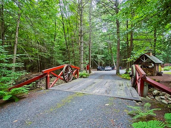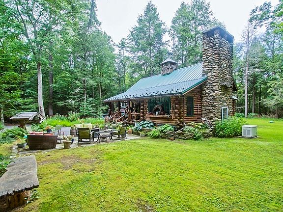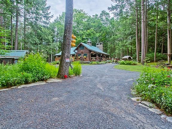 New septic system just installed 4/23. This unique 3 bedroom New England Log home nestled in a private setting on 3.1 Acres is just 7 miles to Amherst center. Loving maintaining & adorned with antique snowshoe shutters, one of a kind wood carvings plus a green metal roof topped with a handcrafted cupola all blend together & set the mood for a true get-a-way feeling. Inside handsome red oak floors with black cherry pegs, two large stacked stone fireplaces, vaulted ceilings and natural cherry kitchen cabinets are just some of the details that add to the charm. A first floor bedroom and full bath allow for single level living. (APO) Windows updated (2016), Basement windows replaced, new chimney flue, and water heater all approximately (2020). Outside are a variety of outbuildings for storage & workshop space plus a large Shelter Logic structure (2019) will accommodate yard equipment & other toys. The seller is willing to leave a number of items. List available.