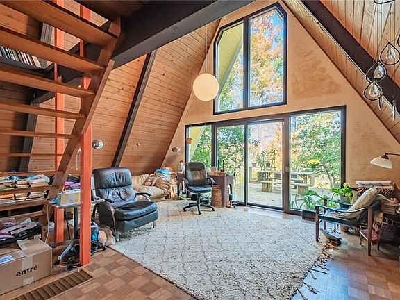 Welcome to your private retreat. Enjoy living in the midst of 5 bucolic acres, surrounded by fawn and forest. This 2 bedroom, 2 bath A-frame has been lovingly maintained by its original owners and is larger than it may appear. The 3 story detached garage, with an 18 x 20 room on the upper level, offers flexible multi-purpose space. Close to Route 8, shopping, restaurants, and entertainment. Convenient access to the Pa. Turnpike.