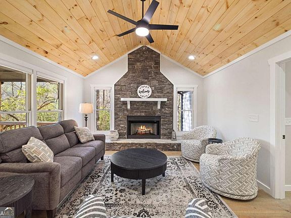 This newly renovated cabin is tucked away on a private 1.58 acres just minutes from the Toccoa River. It is a 2-bedroom, 2-bathroom, charmer, completely upgraded with a new roof, HVAC, hot water heater all new appliances throughout. The original exterior charm of the home was preserved with all new and upgraded interior for comfort and ease. The exterior of the home offers log siding, a built in stone fire pit, an expansive deck, detached storage building and ample parking. Inside you will find a large kitchen with granite countertops & stainless steel appliances that flows seamlessly into the living room complete with a cozy wood burning fireplace. The primary bedroom offers an ensuite bathroom with a double vanity, custom cabinetry and a large shower. You will find hardwood floors, high ceilings, large closets and thoughtful finishes throughout this home. With easy access to hiking and biking trails, the Toccoa River & Noontootla Creek Farms, the outdoor enthusiast will never run out of things to do. Located about 20 minutes from Downtown Blue Ridge, this home offers convenience to all the in-town shopping and dining while being able to go home and be tucked away in your cozy cabin in the woods. This cabin would make a great investment property, weekend getaway or full time home!