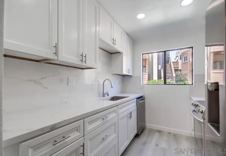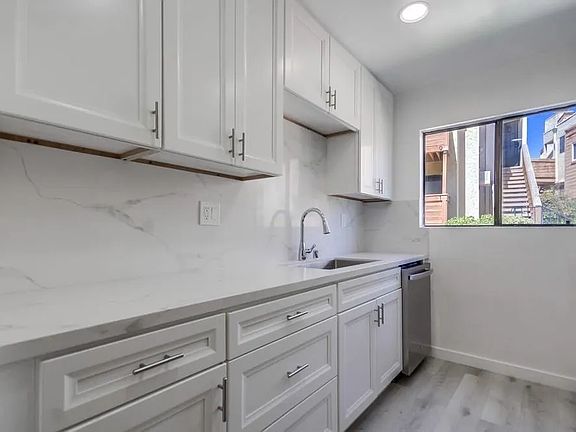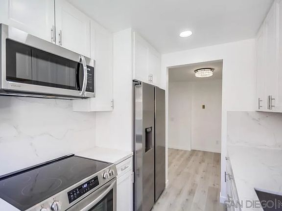 Newly remodeled! Luxury vinyl wood flooring throughout. New cabinets in the kitchen with stainless steel appliances and quartz countertops. Matching new cabinets in the bathrooms with quartz countertops. Large living room with tiled fireplace. Large covered balcony area off the living room with room for storage. Closet area for stackable washer/dryer. It comes with a one-car garage and carport parking. HOA covers water and trash. The location near Freeway 54 is convenient, and being in the exclusive community of Bonita, with awarded schools, makes it even more appealing