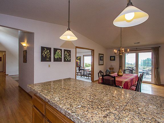 You will find the house airy and inviting. The open floor plan and vaulted ceilings with views of the ocean encourage entertainment or provides privet quite space. The kitchen has a widow box and a skylight that highlights the granite counter tops. The dining room/kitchen with a breakfast bar has a sliding glass door that opens onto a deck with a full view of the ocean. In the master bedroom you also hae a sliding glass door that opens up to a small viewing deck of the ocean. The kitchen, dining room and hall ways are hard wood floors. The front room and the bedrooms have wall to wall carpet. Between the kitchen and the garage is a large laundry and storage room.