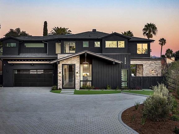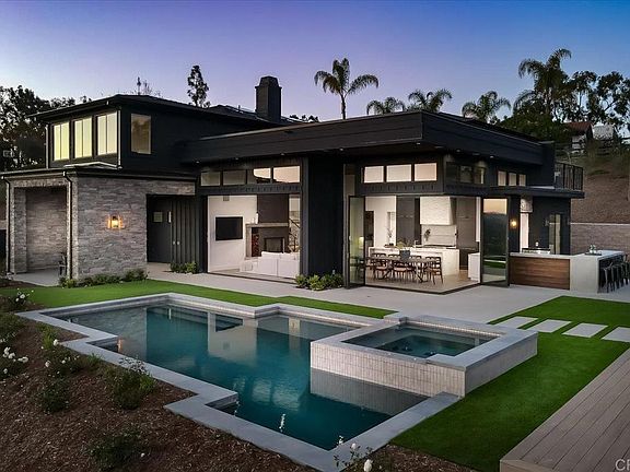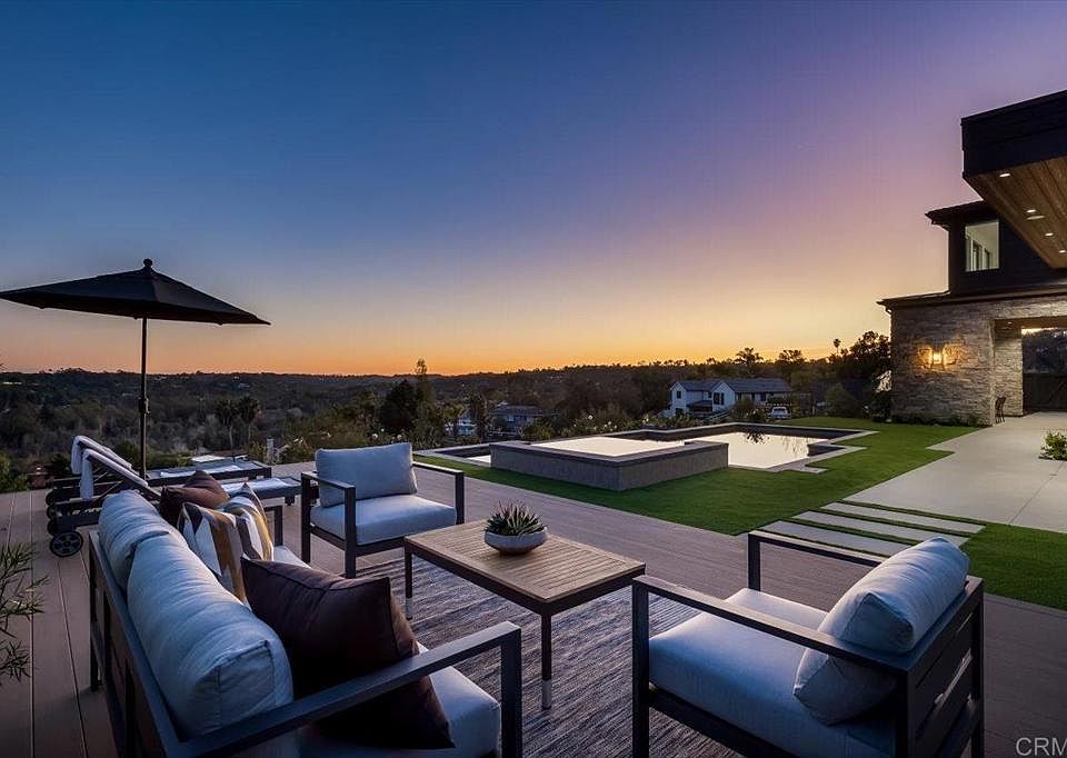 FOREVER VIEWS! Perched high above the Olivenhain valley, this striking Mountain Modern home sets a new standard for custom new construction and architectural design. A long, private driveway ushers you back to the elevated lot that provides stunning sunrise to sunset views over the valley. Pocketing sliding doors create the ultimate indoor-outdoor experience for entertaining on a grand scale or for everyday comfort. Tucked into the hill, the home’s front elevation is inspired by the clean architectural lines of a mountain retreat with the modern conveniences a discriminating buyer has come to expect. Stepping through the 10-foot glass pivot front door, the eyes are drawn past a floating staircase through to the main living spaces and out to the entertaining patio, an edge lap pool, huge view deck and outdoor kitchen. Volume ceilings and clear story windows bathe the oversized Great Room in natural light. The chef-inspired kitchen is adorned with natural quartzite countertops, Thermador appliances and an expansive pantry. Guests will love the full downstairs ensuite bedroom and a bonus rooms can serve as a play room or media room. A stone-clad covered patio perfectly frames the valley views to the south! Rich wide-plank white oak floors provide luxurious warmth and inviting contrast to the Japanese Cypress wood ceiling that carries from the inside living out to the covered patio. Upstairs the opulent master suite is defined by a vaulted ceiling and provides panoramic views over the valley below. The master bathroom suite boasts a steam shower, custom European tile and a dramatic "window wall" with hanging vanity mirrors. The property has been designed for the active Southern California lifestyle and features an oversized 3 car garage with roll-up doors on either end, providing space for a home gym and access to the rear yard. Dual EV car chargers installed. Professionally designed by DeMaria Landtech, the outdoor living spaces embrace functionality and flair. A fully appointed BBQ kitchen looks out to the cantilevered entertaining view deck and a lap pool and hot tub perched at the edge of the slope with spectacular south-facing sightlines. Olivenhain offers a lifestyle beyond compare with hiking and biking trails, horseback riding and a warm community vibe that harkens back to it’s German roots. From Oktober Fest to concerts to art and crafts fairs, Olivenhain exemplifies country living but is just minutes to the coast!