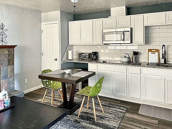 Kitchen & Dining: The kitchen is well equipped with modern appliances, including a stainless steel refrigerator, stovetop, and microwave. Granite countertops provide plenty of space for cooking, complemented by a dining area perfect for meals at home.