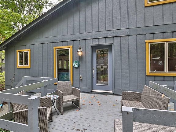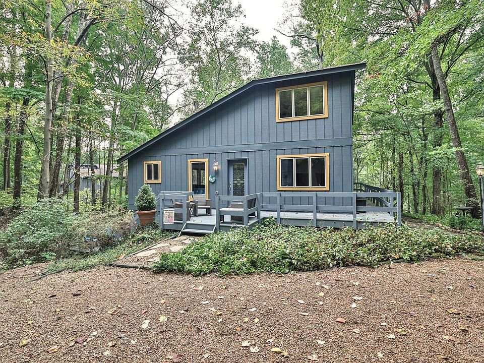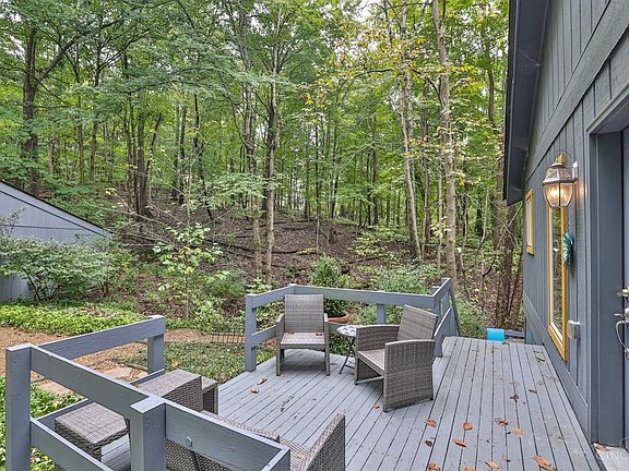 Tucked away on top of a hill, this charming home offers an escape into nature's embrace. The interior greets with warm ambiance featuring a wood-burning fireplace, natural woodwork, and a stained glass window casting soft, colorful light - perfect for gathering with loved ones. The first-floor primary suite feels like a private retreat. A wrap-around deck invites you to take in the peaceful, wooded surroundings. Upstairs are two more bedrooms and a cozy loft in which to unwind with your favorite book. The finished walk-out LL provides extra living space. Two-car garage. New within past 5 years: roof/gutters, heat pump, driveway, Kitchen appliances and counters. Furnace 2017. See Virtual Tour for floor plan.