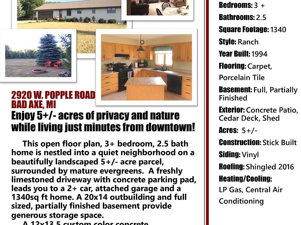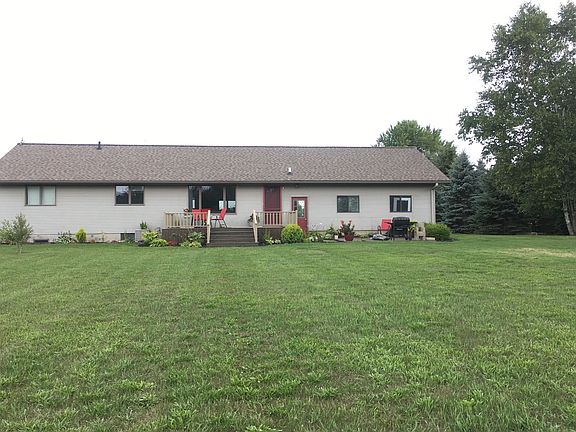 This open floor plan, 3+ bedroom, 2.5 bath home is nestled into a quiet neighborhood on a beautifully landscaped 5+/- acre parcel, surrounded by mature evergreens. A freshly limestoned driveway with concrete parking pad, leads you to a 2+ car, attached garage and a 1340sq ft home. A 20x14 outbuilding and full sized, partially finished basement provide generous storage space. A 12x13.5 custom color concrete patio,10x20 Cedar deck, shade garden with hammock hookup, bricked firepit, and 8x8 elevated play structure/hunting blind, provide entertainment and relaxation for the whole family! 3 bedrooms on the main level with a bonus room in the basement; complete with an egress window and a closet. Laundry hook up is available in the basement or on the main level.