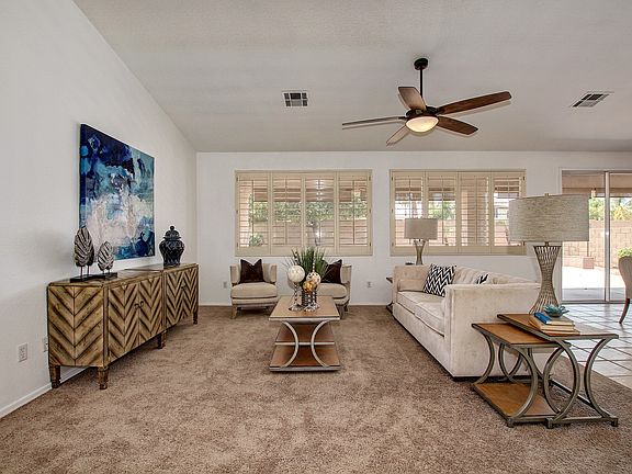 An open floor plan leads effortlessly through this Mesa one-story, equipped with plantation shutters and bamboo window coverings throughout. Enter into the great room, combining the carpeted family room with the dining area. A sliding glass door here leads to the back patio, which extends beyond to a fire pit. Back inside, the eat-in kitchen enjoys a breakfast bar, granite countertops, stainless steel appliances, and a pantry. The Master suite is accessible through double doors, and is subject to a walk-in closet, dual sinks, and a separate tub and shower. This home is minutes from Filiberto's, Walmart Neighborhood Market, and 202 access. All Opendoor homes come with a 30-day satisfaction guarantee and one-year premium warranty. Terms and conditions apply. Open House: Mon-Sun, 6am-9pm
