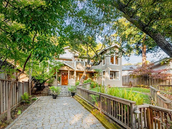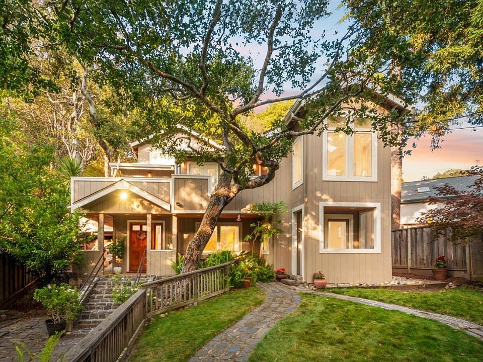 Tahoe-Style Home in a Serene Wooded Setting! Set deep off the street like a private cul-de-sac, this home feels like its own sanctuary. A stone-paved driveway & bridge over a creek lead to a lush lawn & welcoming entry, framed by towering oaks. Daily visits from deer add to the retreat-like atmosphere. Inside, natural light pours through multiple skylights & expansive wood-framed windows. The upper level boasts soaring vaulted ceilings with exposed beams, an open floor plan, and southeast-facing light that warms the space while surrounding trees provide shade. A semi-wraparound balcony w/ a fountain enhances the indoor-outdoor connection. This level offers 2 bedrooms, 2 updated baths, a walk-through closet, & a spa-inspired bath with a large walk-in shower. A versatile flex-room serves as a nursery, office, or family room. The lower level adds 2 bedrooms, 1 bath, radiant heating, & potential kitchenette w/ a separate entranceideal as an ADU. Updated finishes include a modern kitchen w/ SST appliances, stylish baths, remote-controlled skylight shades, & efficient multi-zone heating. Even the detached garage is upgraded w/ drywall, windows, & a stone-paved drive. Conveniently located near Hwy 101, 92, & 280, w/ shopping at Carlmont Village & highly rated Belmont schools close by.