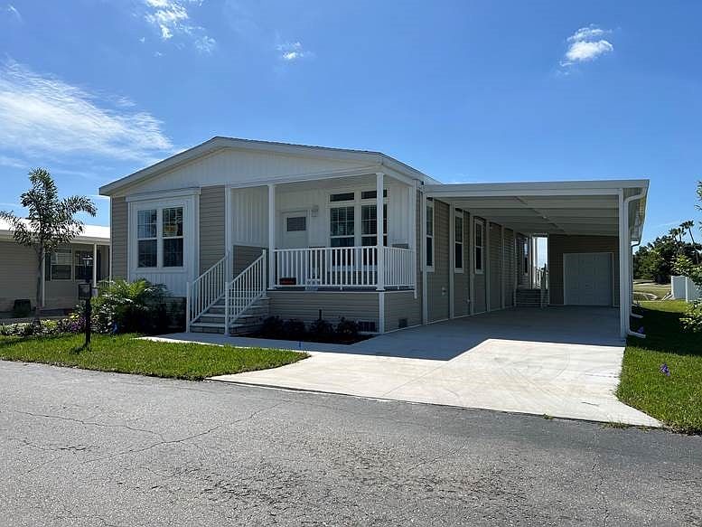 This brand new Manufactured Home is nestled in the Active 55+ Blue Heron Pines Community. Featuring two bedrooms, two baths, a front and back living area, laminate flooring throughout, separate laundry room with washer/dryer hook-ups, carport and outdoor utility shed! Natural light fills the spacious kitchen and back living room highlighting a beautiful backsplash and tray ceilings! Whether relaxing on the deck and enjoying the water view or entertaining guests, this turn-key home is the perfect oasis and a must see! Call today for an appointment.