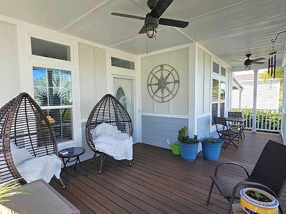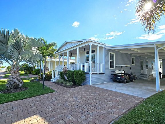 Welcome to this stunning 2018 manufactured home located in a premier 55+ golf course community where golf carts and pets are welcome. The community offers lawn maintenance included, a large and elegant clubhouse with library, gym, craft studio, and a full calendar of activities, making every day feel like a resort experience. This spacious 1,500 sq. ft. home is thoughtfully designed with 10-foot ceilings, tray ceilings, and beautiful finishes throughout. Offering 2.5 bathrooms and two master suites-each with its own rare double-sink vanity-this home provides comfort and convenience in every detail. The open floor plan includes a bright kitchen with stainless steel appliances, a pot filler above the stove, extra cabinetry, and a pantry in the mudroom. The home comes furnished with a 2024 Maytag washer and dryer, plus recent upgrades including a 2023 shingle roof and 2018 AC. Enjoy breathtaking views of the golf course from both the large front and back porches, perfect for relaxing or entertaining. Additional highlights include a golf cart garage with storage, a long driveway with carport, and exceptional model-home details such as rounded wall edges and custom molding. This rare offering combines luxury, functionality, and community living at its best, all for a monthly lot lease of $971.Call Lulu and David for showing! You will find our contact either on the website or on the 6th photo! See you soon!