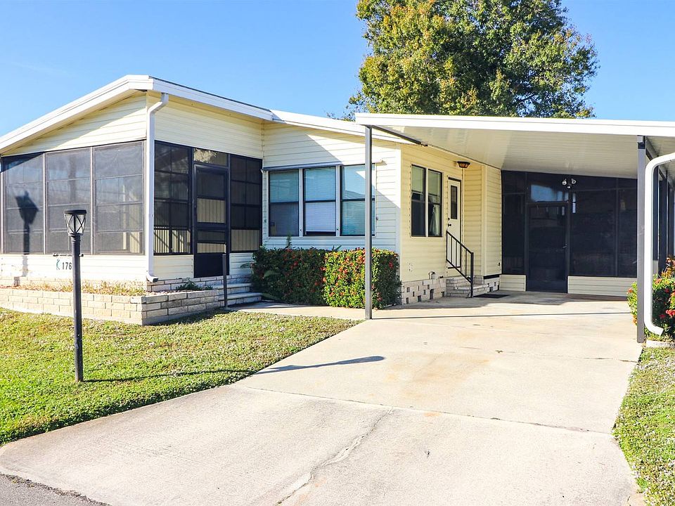 Welcome to Paradise in Blue Heron Pines 55+ Active Community: 29200 Jones Loop Rd #176, Punta Gorda, Fl. 33950. Unfurnished Fixer Upper Priced to Sell! 1989 Suncoast Doublewide Manufactured Home approx. 960 sq. ft. Two BedRoom Two Bath with Screened Lanai & Shed with Two Car Carport! Enter Front Entry to Open Concept LivingRoom/Dining Area. Vaulted Ceilings. Primary BedRoom accommodates Queen Size Grouping. Master Bath Shower & Privy. Guest BedRoom accommodates Queen Size Grouping. Guest Bath has Tub/Shower Combo. Hall leads to Livingroom slider to Screened Lanai for additional CarPort access. Schedule Your Showing Today to start Living the Florida Dream!