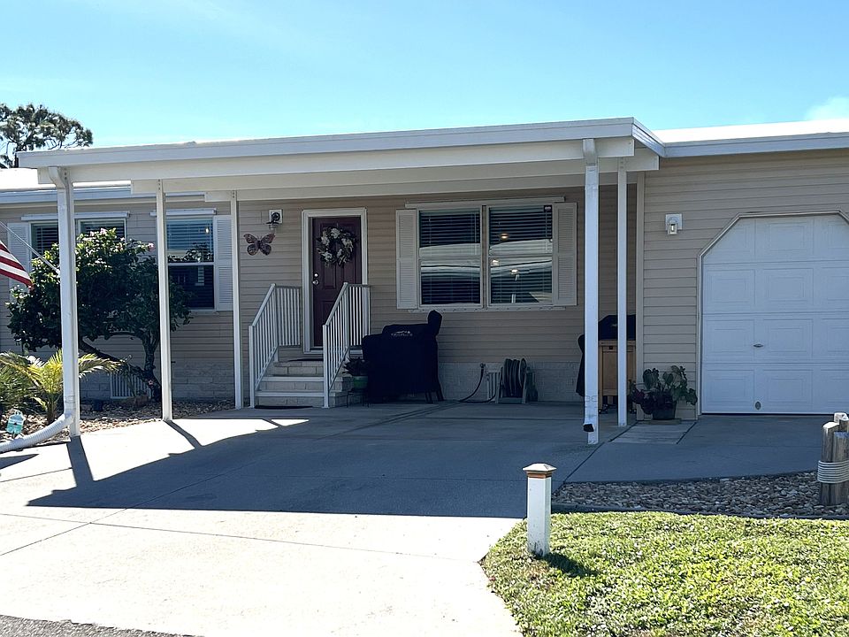 Welcome to this beautifully updated 2003 Merit home located in the highly desirable 55+ active community of Blue Heron Pines with an executive 18 hole golf course intertwined throughout the premises. This 3 bedrooms and 2 baths home offers 1,232 sf ft of comfortable living space and has been thoughtfully renovated for modern convenience and Florida living at its best. This home features an HVAC heat pump & AC (Jan 2018) for efficient and reliable comfort year-round, new kitchen appliances (Dec 2022), renovated kitchen, bathrooms and bedrooms (2022-2023) with stylish finishes and updated fixtures and new carpet in 2 bedrooms.In addition, there is new lighting throughout creating a welcoming atmosphere. The Florida room has adjustable window panels and pet resistant screens, perfect for relaxing or entertaining.Relax outdoors on an open patio with retractable awning allowing you to enjoy shade or sunshine at your leisure. There is a two-car wide driveway for convenience and a fenced dumpster area for added privacy.The exterior of the home has a membrane roof (2016) which is durable and low-maintenance. There are aluminum storm shutters and Bahama shutters on the primary bedroom windows for enhanced storm protection.The Community Center offers a fitness center, library, craft room, fully equipped kitchen, billiards room, and large central area for social events and activities. Blue Heron Pines has a heated swimming pool with sun deck, shuffle board, horse shoe play area, fenced dog park, fenced RV storage area and fishing lakes.