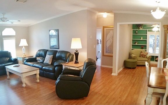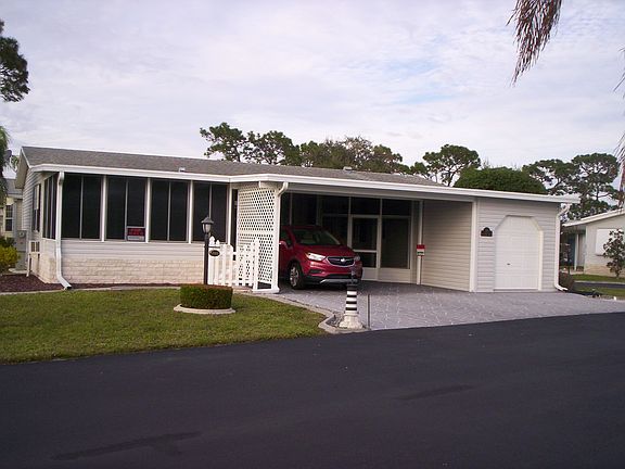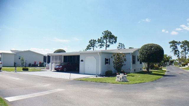 Your Dream Home! is awaiting in sunny Florida! This 2004 Jacobsen Classic model is partially furnished, approx. 1456 sq ft under air. Interior is decorated with professionally painted walls, crown molding, plantation shutters, ceiling fans, bead board with chair rail, oak laminate floors throughout, guest bedroom carpeted with berber tan, additional den/office/library with built in bookshelves. Living room has vaulted ceilings with 3 window displays for more natural light. Master& guest bathroom have 8 inch white tile to accent, additional linen closet in hall between bedroom & guest bathroom which has tub/shower combo. Master bath has low rise shower, dual sinks and more storage for linens & more. Kitchen cabinets have beveled glass door/curio display for fine china, matching white appliances 5x5 refrigerator, stove & dishwasher 2015, washer 2018, hot water heater 2013, A/C 2012 with a newly signed maintenance agreement in 2018. Roof has 30 yr architectural upgraded shingles 2004. Exterior hurricane clear tabbed panels, telescoping, 20'' flag pole, textured flagstone driveway which accommodates 4+ cars. Oversized 10x20 golf cart garage with electric door opener, inside large loft storage, work bench, textured floor, insulated roof. Lanai is screened with tinted all weather vinyl slide windows, durable indoor/outdoor carpet. All of these upgrades in excess of over $25,000 are included in this model home located on an oversized corner lot in this pet friendly 55+ golf community in Punta Gorda Florida at Blue Heron Pines.