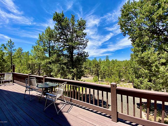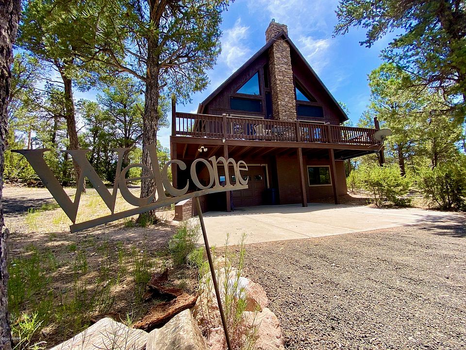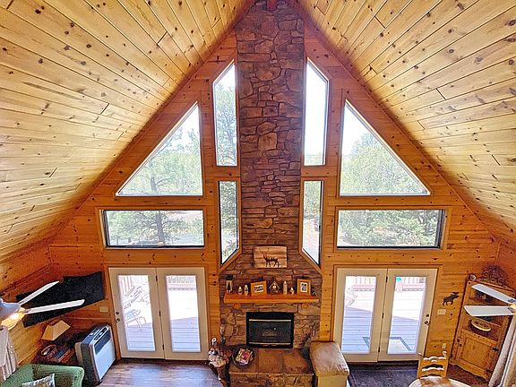 Your cabin search is finally over! This established Airbnb multi-level chalet has it all, w/BRs on all 3 levels + loft! Miles of pinetop views on a secluded acre, step into a lodge-like great room w/towering T&G ceilings, new wood laminate floors, natural light, & grand stone fireplace! The walkout basement provides addtl space to enjoy w/new log pool table & 2nd gas fireplace! Other features include new ext paint, new water heater, radiant heat, portable ACs new back deck w/ramp, dual pane windows, new children's playhouse, outdoor firepit w/seating, + 1 car garage! The pull-thru drive makes trailering your horses or parking an RV a breeze. Modest HOA includes water too! Sold FULLY FURNISHED, just bring your PJs and your toothbrush! So much to love, come check it out before it's gone!