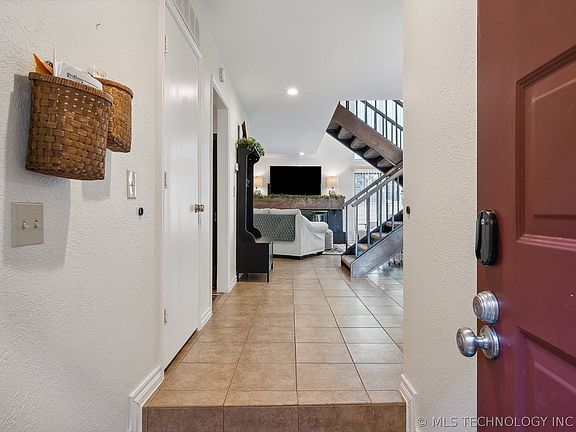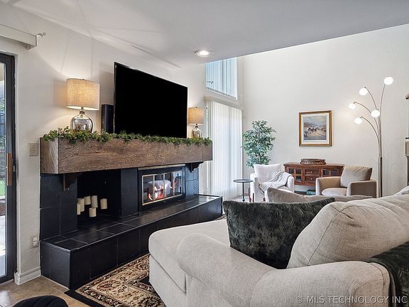 Discover your new home at the Timbers Condos renowned for its South Tulsa location, Jenks schools and easy access to Riverside Parks and other local amenities. This pet friendly community is perfect for any generation and offers a variety of activities including tennis courts, pickleball courts, swimming pools and clubhouse. The gated access makes it easy to lock and leave since the exterior maintenance is provided by the HOA. This home has been recently updated and the large windows fill the space with natural light. This flexible open floor plan has two dining areas that allow for a flex space if desired. The fireplace is a focal point that is flanked by large windows and patio access. The kitchen with double ovens has a pantry and plenty of cabinets and prep space. The primary suite upstairs has a sitting area and updated private bath in addition to a walk in closet. The spacious second bedroom also has a walk-in closet. A private office with massive window has a tree house feel and can easily transform into a guest bedroom or upstairs media space. Updated hall bath. Covered and open patios in addition to a gated front courtyard with patio are both perfect for dining or relaxing. Two car garage with attic storage.
