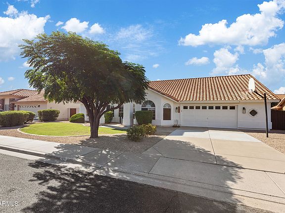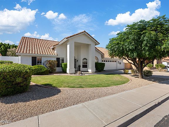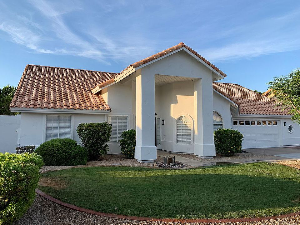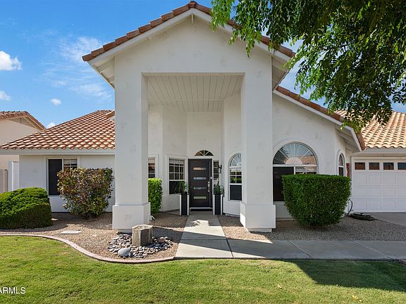 Beautifully elegant home located in Mesa! This highly upgraded 3 bedroom, plus a den home offers a large lot, complete with an open floor plan and luxurious backyard oasis. Walking up to the home, you can not miss the newly painted exterior. As you walk in the front door, you are welcomed by the spacious front room and elegant formal dining area, perfect for entertaining. As you pass through the hallway, you will enter into the grand living area complete with vaulted ceilings and fireplace. The granite around the fireplace adds an exquisite touch to this space. The updated kitchen offers white quartz countertops, ample cabinet space, beautiful white tile backsplash, and matching stainless steel appliances. The kitchen also features large windows, allowing for natural light and views of the