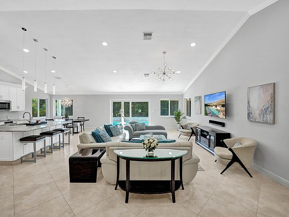 Indulge in this spectacular sanctuary in the immaculately maintained subdivision of New Floresta. This 4 bedroom, 2 bath home has 2,607 sq ft on an oversized 1/3 acre lot with a fountain pool, covered patio, fenced yard with lush landscaping including mango and lime trees. This property has a split floor plan perfect for optimal privacy when entertaining guests. The bright, open concept with vaulted ceilings creates a warm inviting appeal with an opulent kitchen consisting of white shaker cabinets, quart countertops with a large island, and newer Kitchen Aid SS appliances overlooking the tranquil and tropical backyard and pool. The primary suite is extravagant with sliding doors to the pool, an updated bathroom with a spa shower, double vanity, quart countertops, and new backsplash. Large custom built closet perfect for your designer goods. House has a large renovated mud/utility room with newer Samsung washer and dryer, cabinets and sink. New Impact windows and doors, Newer Roof from 2019, New AC from 2020 and New Hot Water Heater from 2021 makes this purchase stress free. Other improvements include new exterior and interior paint, new smart irrigation system, modern light fixtures, recessed lights, 2 car garage with cabinets, new driveway, new gutters, new pool motor. New Floresta is zoned for A+ rated schools, minutes to the Town Center Mall, 5 miles to the beach, conveniently located between 95 freeway and Turnpike. Walk to places of worship, drive to restaurants, FAU, Lynn University. Low HOA and no lease restrictions.
