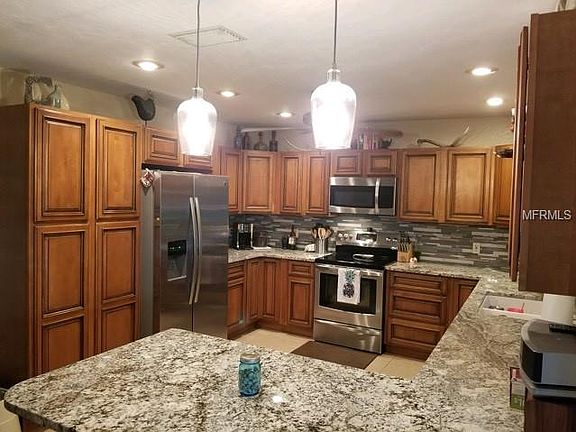 Stunning 4 Bedroom 2 bathroom Peace River Shores home featuring beautiful upgrades and situated on a double lot with gorgeous oaks! When you walk into this home the first thing you notice is the wide open space and wood grain porcelain tile flowing through the foyer, living room, dining room and hallway. Through the living room you will find the open concept kitchen and dining room with gorgeous dark wood cabinetry, granite counter tops, glass tile back splash and newer stainless steel appliances. Down the hallway are 3 spacious bedrooms with large closets and guest bathroom. On the other side of the home is your private master getaway and upgraded master on-suite! Through the french doors you have a fully screened lanai to enjoy your morning coffee or peaceful evenings with your family!