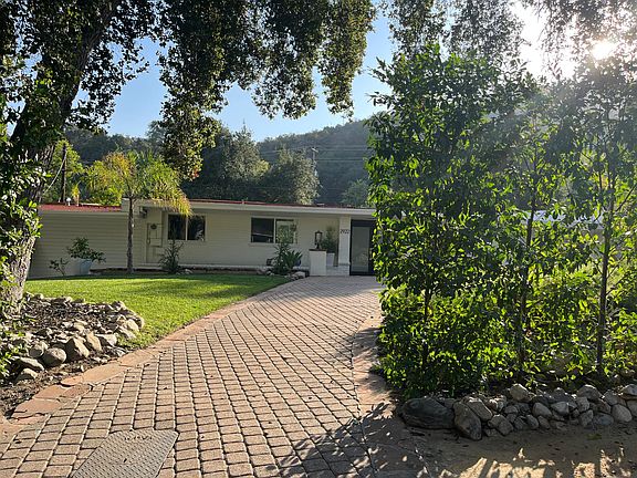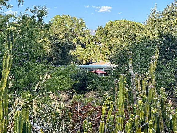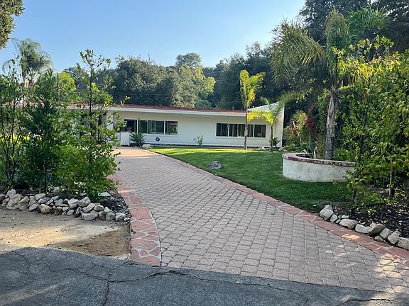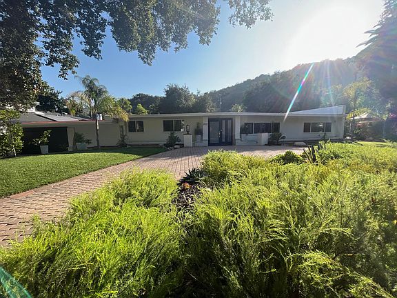 Owner pays gardener and pool cleaner. Classic boomerang-shaped Post War single-story abode in the urban oasis of Honolulu Annex, sits on a doublewide lot with circular driveway, surrounded by lush landscaping, mature palms, and oak trees. The Modern broad elevation has horizontal roof lines, deep overhangs, and a dramatic glass wall overlooking the pool that brings the outdoors in and captures serene views of the Verdugo Mountains. A soft white interior palette with updated hardware and wide plank floors add to the understated yet luxurious aesthetic. U-shaped driveway including a huge driveway in front of two car garage. Each room has an A/C unit. Small dog or cat is possible. There is a separate one bed/one bath unit apart from main house with a separate entry on the other side of the garage, with no shared walls, that is rented out to the same person for the last three years. Very quiet. 1 year to month to month renewable.