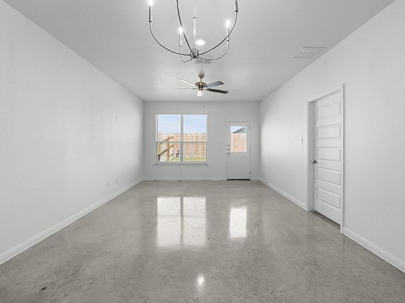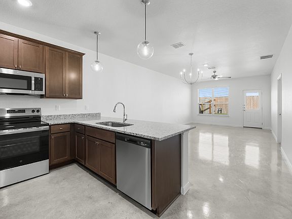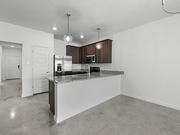 This never-lived-in home features an open-concept layout with polished concrete floors, recessed lighting, and abundant natural light. The kitchen includes quartz countertops, modern cabinetry, a large island with pendant lighting, and brand-new stainless steel appliances, making it ideal for both daily living and entertaining.