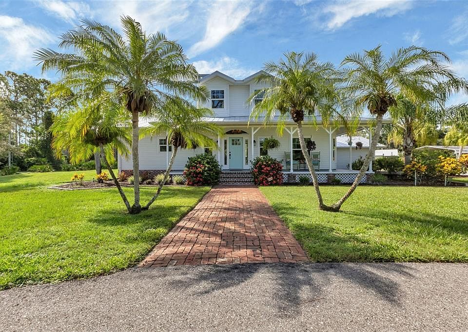 Picturesque 2.5-acre Property in the Charlotte Ranchettes! This enchanting estate offers the perfect blend of peaceful country living and easy access to schools, shopping, and dining. Imagine yourself relaxing on the charming front porch with a cool drink in hand, soaking in the serene surroundings. Step inside, and you'll be welcomed by a cozy family room featuring a wood tongue-and-groove vaulted ceiling, solid red oak flooring, and a wood-burning fireplace. French doors from the family room open to the lanai, creating a seamless blend of indoor and outdoor living. The beautifully remodeled kitchen boasts sleek stainless LG appliances, expansive granite countertops with a built-in breakfast bar, rich, dark wood cabinets with contemporary finishes, soft-close drawers, pull-out shelving, and a large pantry. The dining area is ideal for family meals and entertaining friends. Conveniently located next to the kitchen is the full laundry room, with easy access to the oversized 2-car garage and a full pool bath. Adjacent to the kitchen is a versatile space with a bay window, perfect for an office or den, with a half bath situated nearby. The spacious primary suite is your private retreat, complete with a luxurious spa tub, a large tiled walk-in shower, and an expansive walk-in closet. Pocket sliders from the primary suite open to a sunlit room, perfect for your morning coffee, a craft area, or a cozy reading nook. This inviting space also has doors leading to both the lanai and the family room. Upstairs, two generously sized guest rooms share a bath, with one of the bedrooms offering a direct door to the bathroom. A landing overlooks the living room below, enhancing the home's open and airy feel. Outdoor living is the crown jewel of this property, designed for both relaxation and entertainment. Step onto the screened lanai and admire the cypress tongue-and-groove ceiling, creating a warm and inviting atmosphere. Take a dip in the heated saltwater pool and spa, or for those who love to stay active, a regulation-sized lighted beach volleyball court beckons for spirited matches! Spend your evenings roasting marshmallows around the backyard fire pit. The expansive property offers plenty of room for yard games, a garden, or whatever your imagination leads you to! Rest easy knowing there's plenty of space for all your toys, tools, and vehicles with a second oversized 2-car garage, complete with a workbench and a rear entry overhead garage door. Additionally, a 26’ X 35’ shed provides even more storage for all your needs. The circular driveway offers ample parking for family and guests, making this home a true entertainer's paradise. Additional features include a whole-home reverse osmosis, impact windows, hurricane shutters, and a zoned AC system. Adding to its appeal, this home is just minutes away from Highway 75, providing easy access to the beautiful beaches along the Gulf of Mexico and the vibrant cities of Fort Myers and Sarasota. This unique and charming property offers a lifestyle of peace, comfort, and endless possibilities! Schedule your appointment today!