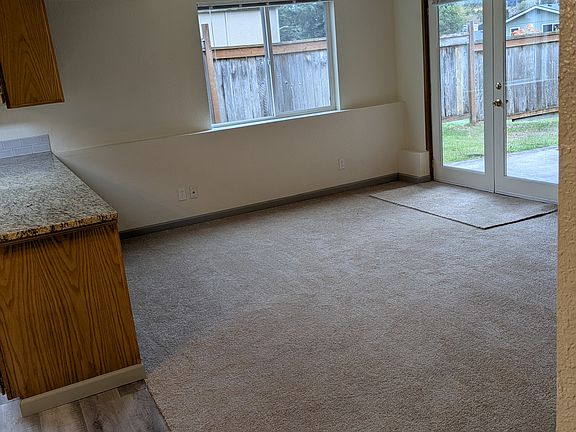 Large living room with new carpet and a wood burning fireplace. The French doors off the living room open to a covered patio that overlooks the privacy fenced backyard. Updated kitchen with granite countertops, water resistant flooring and beautiful oak cabinets. Up-dated bathrooms have granite countertops and tile flooring.