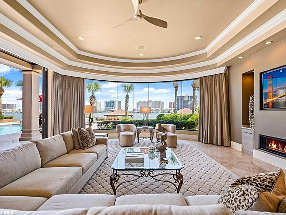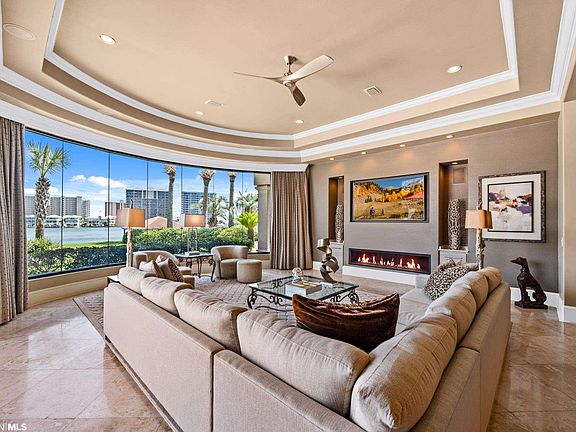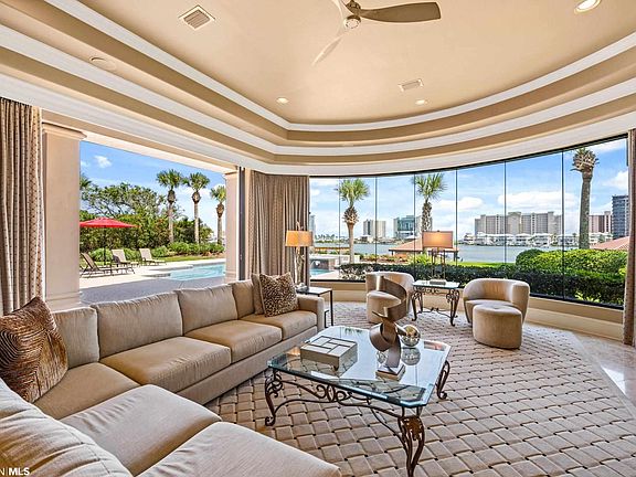 Luxurious waterfront living awaits your arrival! This stunning Ono Island home provides the ultimate indoor/outdoor entertainment experience and offers breathtaking views of Ole River and the Gulf of Mexico. Conveniently located close to the Ono bridge, the house is perfectly situated on 100 feet of pristine water frontage and is nestled among an abundance of mature landscaping providing unparalleled privacy. With almost 9,500 total square feet, the home offers a seemingly endless amount of space to live, entertain, and relax. The home is being offered fully furnished and features a wall of curved glass upon entry, ceiling heights ranging from 10' to 12', intricate ceiling detail throughout, eight-foot doors, two fireplaces, progressive sliding glass doors, large 24' travertine tile, whole-house sound system, and an over-sized three car garage. The beautifully remodeled kitchen effortlessly flows into the living room and features clean lines that exude elegance, granite countertops, soft close drawers and cabinets, under-cabinet lighting, open shelves, a curved glass bar with seating for four, and Sub-Zero, Wolf, Bosch, and GE Monogram appliances. The house boasts two master suites with the primary master suite offering stunning views of Ole River, his and her walk-in closets, two vanities, large jetted tub, and a massive walk-thru shower. Upon exiting the home through the sliding glass doors that disappear into the living room wall, you are welcomed by a 956 square foot covered outdoor space featuring wood ceilings, large flat screen television, full outdoor kitchen, and a saltwater pool and hot tub. As you make your way from pool area to the boat house, you are greeted by a massive white sand beach offering easy access to the water's edge. The boat house is equipped with a 13,000 lb. boat lift, large storage area, surround sound, and a brand-new bar area with a retractable cover. Experience waterfront living at its finest & the time is now!