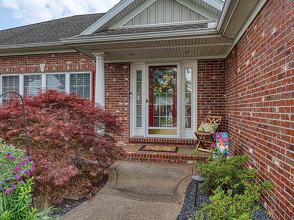 This well-maintained home in the Carrington Estates subdivision, built by Jimmy Kaster, offers three bedrooms and two and a half bathrooms. The brick exterior is surrounded by beautifully landscaped grounds, featuring Japanese maple trees, viburnum shrubs, arborvitae shrubs , Canadian red trees, and wisteria vines—all creating a private, lush setting around the pool. An irrigation system helps keep the lawn and plants green. Inside, the spacious living/great room has a bright, open feel with wood flooring and a gas fireplace. The kitchen includes plenty of quality cabinets with pull-out drawers, a large pantry, breakfast bar, and an island that looks into a flexible extra room—perfect as a second dining area or cozy sitting space. The split bedroom layout offers privacy, with the primary suite featuring glass French doors, a large bathroom with a whirlpool tub, separate shower, and double sinks. Nearby, the all-season room has its own ductless HVAC system and overlooks the pool. An office is conveniently located near the primary bedroom, just across from the laundry room and close to the garage. The garage includes a dedicated 20-amp circuit, and the pull-down attic has added flooring for extra storage. A utility shed with 110 electricity adds even more functionality to the property. The backyard is a private oasis with an in-ground pool, surrounded by lush landscaping and beautiful outdoor lighting that creates a warm, inviting atmosphere—perfect for evening swims or relaxing by the water. A charming poolside storage shed offers convenient space for outdoor gear, and a manual awning provides a nice shaded spot to relax during the warmer months.