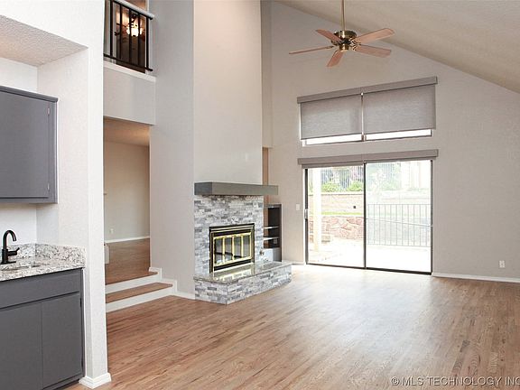 Fabulous updated corner Condo located in South Tulsa & in Jenks Schools. So many new features including new wood floors, new tile floors, new granite, fresh paint, new stainless steel appliances, new side by side refrigerator, newer a/c units, & carpet is two years old. Formal dining located off kitchen. Vaulted living room with fireplace & wet bar. Primary bedroom with sitting area. All bedrooms feature walk-in closets. Huge storage closet located on landing upstairs.Half-bath located on first floor. Washer & dryer stay. As well as the garage fridge! Great patio area in back. Two neighborhood Pools & Tennis Courts.