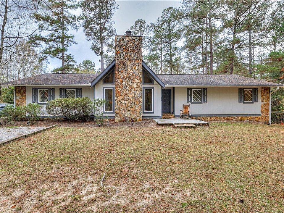 Dreaming of owning acreage, with a pond, and still be in town? This is your chance! This chalet style home is tucked away off Belair Road on 3.7 private acres, minutes to Fort Eisenhower and close to everything you need. As soon as you walk through the front door you will feel like you're in a mountain retreat! The foyer leads you into the living and dining rooms that boast vaulted ceilings, beautiful wood beams and a wall of windows overlooking the sprawling backyard and pond. A back door leads you out onto a fantastic deck that is the perfect spot to relax and take in the view. The eat in kitchen is just off the dining room, has access to the garage and all appliances remain. The owner's suite features a private ensuite bathroom and two closets. Two additional bedrooms and a full bathroom are also located on the main floor. Downstairs you will be pleased to find 904 square feet of additional heated and cooled space that includes two bedrooms, a jack and jill bathroom, laundry room, mudroom and a bonus room. This home truly has so much to offer and all the conveniences of location and space! Some recent updates include LVP flooring and fresh paint throughout the main floor living spaces. The roof was replaced within the last 5 years. The two separate septic systems have been serviced and the exterior of the home was completely painted within the last 2 years.