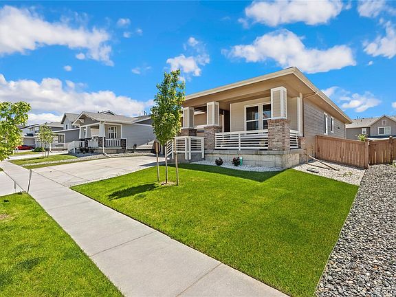 Meticulously maintained ranch home ideally located in Brighton’s desirable Prairie Center Village community! Surrounded by a new 6-ft privacy fence, this beautiful residence offers 1,531-square feet of open living space all on one level. A classic covered front porch with new railings provides a warm welcome to a light and bright open layout enhanced with easy-maintenance luxurious vinyl plank flooring throughout, efficient recessed lighting, and a perfect neutral color palette great for any décor. Home chefs will enjoy the kitchen boasting extra upper cabinetry, modern stainless steel appliances, including a gas range, sleek quartz countertops, and an expansive center eat-in island for extra seating options. The primary bedroom is located opposite the guest bedrooms for extra privacy and offers an en-suite bath and walk-in closet with new custom organizer. Beautiful private backyard with new landscaping, a covered patio with new steps and railing, a new walkway from patio to garage, and charming raised garden boxes for fresh herbs and veggies. There’s even a mountain view off the backyard patio! New owned outright solar panels help keep energy costs low! Located within minutes to groceries, hardware stores, dining, and minutes to Barr Lake S.P. with plenty of activities for the outdoor enthusiast to enjoy. This move-in-ready gem needs nothing for you to do but move right in and call it home!