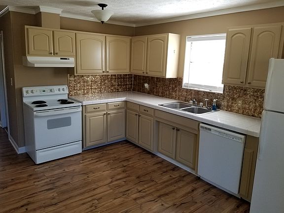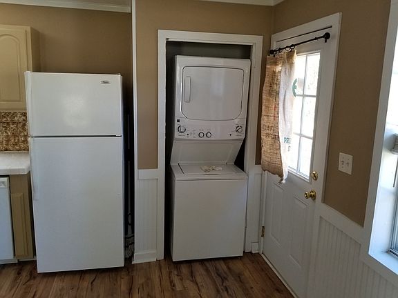 Brick home situated in a charming country setting on large corner lot (1/2 acre+/-) with Mature Trees. Front porch and wood-stained shutters gives this home a "cottage" style. Laminate flooring throughout home. Open concept LR and kitchen give an open feel. Kitchen has ample counter and cabinet space and features a washer/dryer combo. Three bedrooms with ceiling fans and nice size closets. Bath is a good size with vanity and storage. Large yard with privacy fence. 1 year home warranty provided. Nice property.