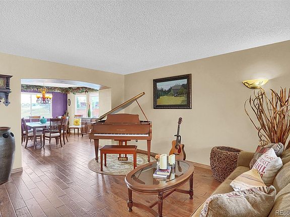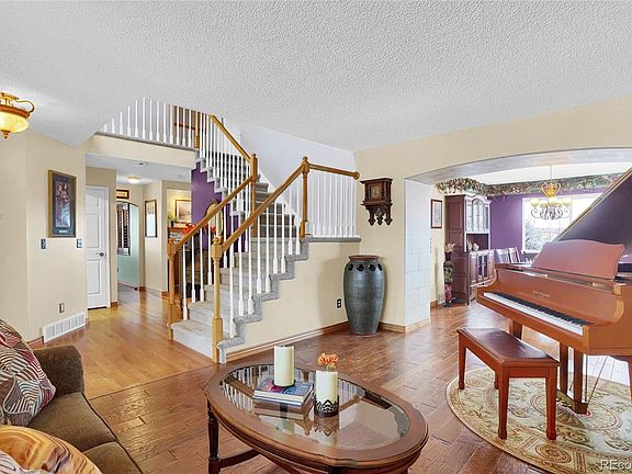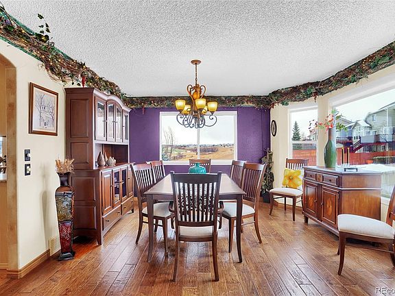 Amazing location w/ Pikes Peak views! This home sits on a cul-de-sac, backing to open space w/ walking/bike trails & quick easy access to the elementary school, John Venezia Park w/ Splash Pad, & a large sledding hill. The elegant 2-story entryway features wood flooring and welcomes you into the rest of the home. The living room is adorned w/ engineered wood flooring, a window seat overlooking the front of the home, & mtn views. The dining room adjoins the living room through an archway & not only continues the engineered wood flooring but has a bay window & views of the open space & park. The spacious kitchen includes granite counters, travertine tile backsplash, hardwood floors, stainless steel appliances, an under-mount black composite sink, a pantry, a built-in desk, & a breakfast bar w/ wrought iron corbels. Adjoining the kitchen is an 8x8 eating space/nook featuring a bay window & a door leading to the 18x36 spacious deck w/ a gas line & built-in fire pit. The family room connects to the kitchen & eating space/nook, making this floor plan open & welcoming. The family room has engineered wood flooring, surround sound, a gas fireplace w/ a stone surround, & vaulted ceilings. Also located on the main level is a 1/2 bathroom, a laundry room, & an office w/ an arched entryway & built-in shelving & desk. The upper level offers 3 secondary bedrooms, a linen closet, a full bath, & a master bedroom adorned w/ tongue & groove wood ceiling, a sitting area w/ a bay window, & an attached 5 piece bath w/ a large soaking tub, walk-in closet, 2 sinks, 2 medicine cabinets, & lots of natural light. The walkout basement has 2 additional bedrooms, a full bathroom, a wet bar w/ Corian counters & a seamless sink, 2 under counter refrigerators, a microwave, a game table/dining area, & a 2nd family room w/ a built-in theater system. Fully finished 3 car garage w/ attic storage above. Exterior amenities include a 14x21 enclosed under-deck storage, landscape lighting, A/C, more!
