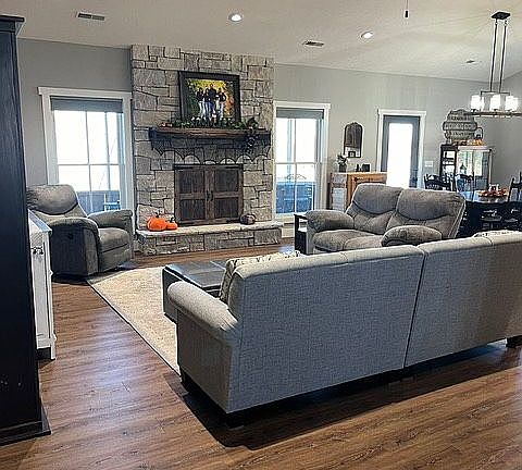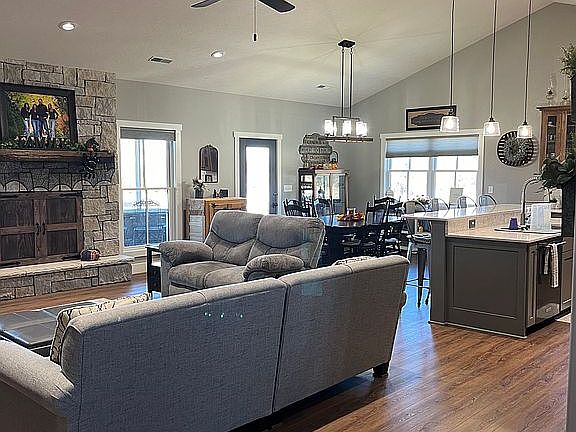 Beautiful country home with gorgeous sunsets. Builders Home, built on 6.65 acres. 3 bed, 2 bath. Kitchen Aid Appliances, Commercial Gas Stove 48” Duel Stove, Pantry, Gas Fireplace, Screened in Porch, All Weather Safe Room 4 outside buildings.