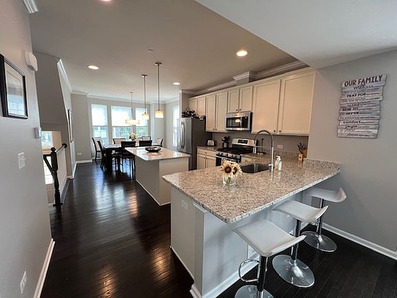 This beautifully upgraded Foster model end unit built 2019 offers exceptional style and convenience in a sought-after Emerson Park location. SUPER LOW RATE assumable mortgage available for qualified FHA buyer. The open-concept main level features rich dark hardwood flooring throughout, beginning with a versatile front flex room-perfect as a living room or formal dining area-that flows seamlessly into the gourmet kitchen. The kitchen is a true showpiece, with a center island, white 42-inch soft-close cabinetry, granite countertops, and stainless steel appliances, including a Whirlpool French door refrigerator, GE oven/range, and GE dishwasher. The spacious 20' x 13' family room offers plenty of space for entertaining and opens to a private balcony. Hardwood flooring continues on the second-floor landing and into the huge loft, ideal as a media space or additional living area. The luxurious primary suite boasts its own private balcony, a walk-in closet with custom organizers, and a spa-like primary bath with dual-sink vanity, walk-in shower with designer tile, and a linen closet. The second bedroom features an attached full bath complete with a deep soaking tub and designer ceramic tile on both the walls and floor. A bright 5' x 3' laundry room with window comes equipped with a Whirlpool washer and dryer. The finished lower-level bonus room makes a perfect home office, workout area, den or possible 3rd bedroom. Additional highlights include custom window treatments (blinds and curtains), designer lighting, and a move-in ready condition-it's all been done for you. Enjoy the unbeatable Emerson Park location, within walking distance to the Metra Park & Ride and Wolf Crossing Community Park, and served by highly rated District 204 schools.