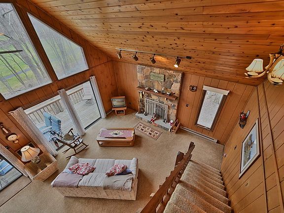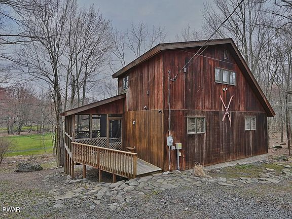 Nice chalet home on the golf course in the Hideout, a Four-season amenity filled community in the Northern Poconos, just two hours from NYC and Philadelphia areas. This home has three bedrooms, two bathrooms, an open floor plan, living room fireplace, Master bedroom with private bathroom , a finished lower level with wood stove and wet bar, and unfinished Storage room that is rough plumbed for future expansion. There's also a screened in porch and a deck. This home does need some updates, and is priced accordingly.