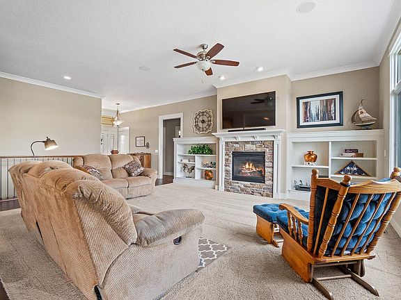 - Sound System, Ceiling-9+, Tray Ceiling(s), Ceiling Fan(s), Walk-In Closet(s), Stone Counters, Eat-in Kitchen, Entrance Foyer, Kitchen Island, Open Floorplan, Split Br Floor Plan, Double Vanity, Wired for Data, Stand Up Shower, Main Level Bedroom Suite, Formal Dining Room, Great Room, Custom Cabinetry